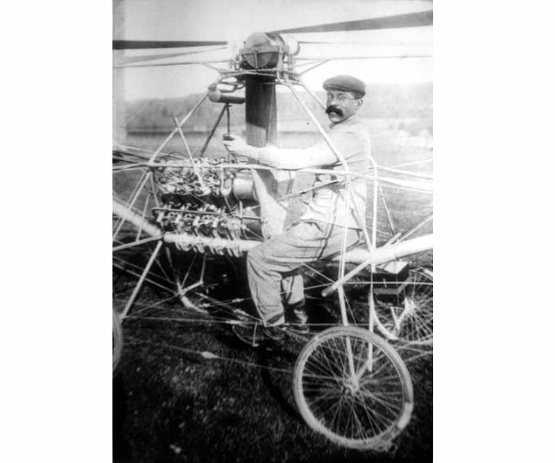 Paul Cornu in his experimental helicopter, achieving the first manned vertical take-off and sustained flight in 1907 (Design World)
