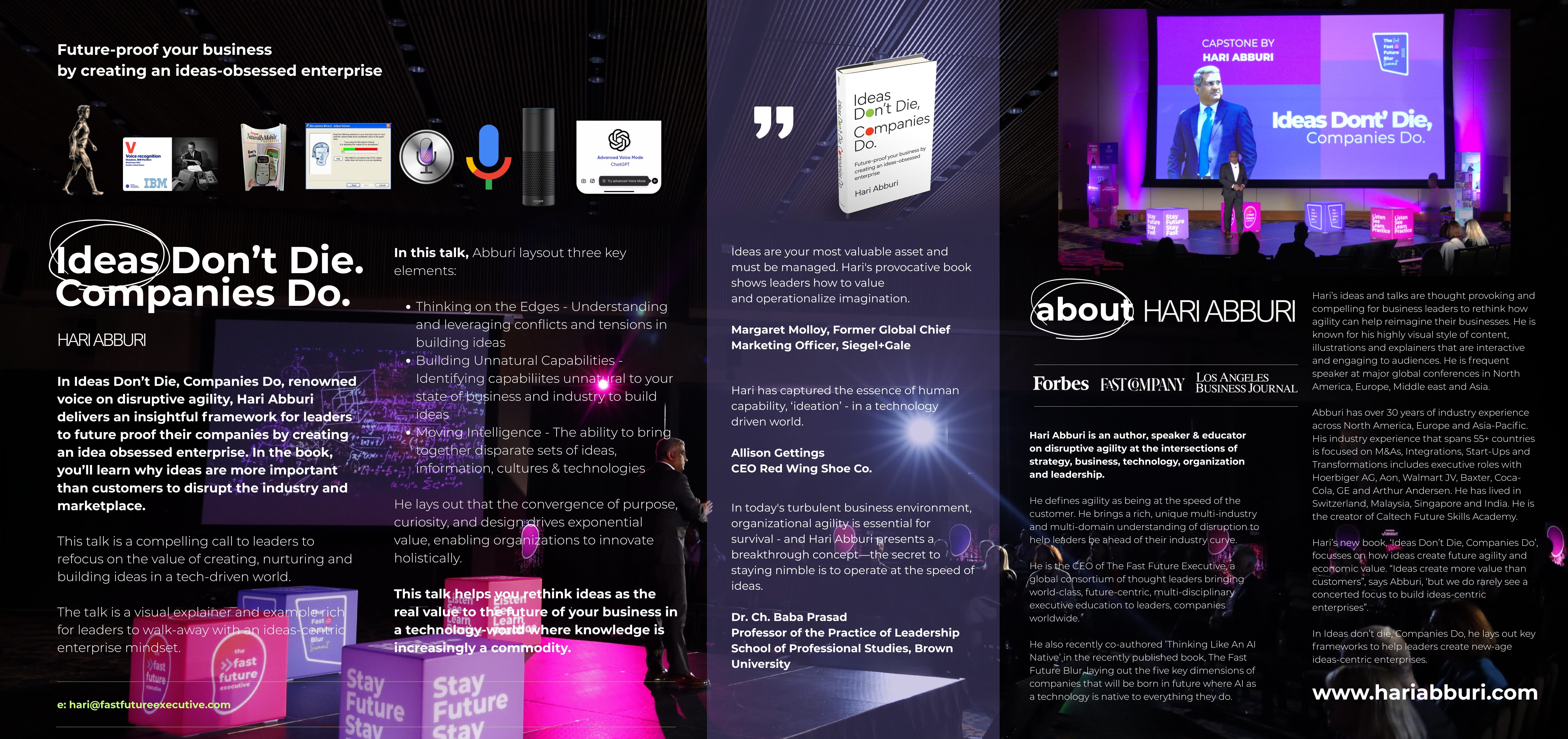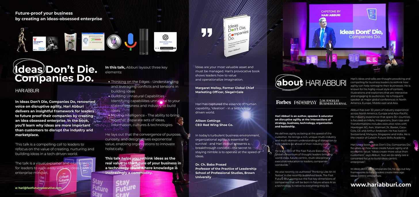 The interview by Toby Chapman-Dawe opens with a brief introduction to Hari Abburi, CEO of The Fast Future Executive and author of Ideas Don’t Die, Companies Do: Future-Proof Your Business by Creating an Ideas-Obsessed Enterprise. The discussion centers on agility, which Abburi identifies as the central theme of his book. He explores how agility has evolved—from the era of linear manufacturing and conglomerates, focused on efficiency and capital allocation, to today’s AI-native world, where intangible assets such as data, IP, and ideas dominate value creation.
